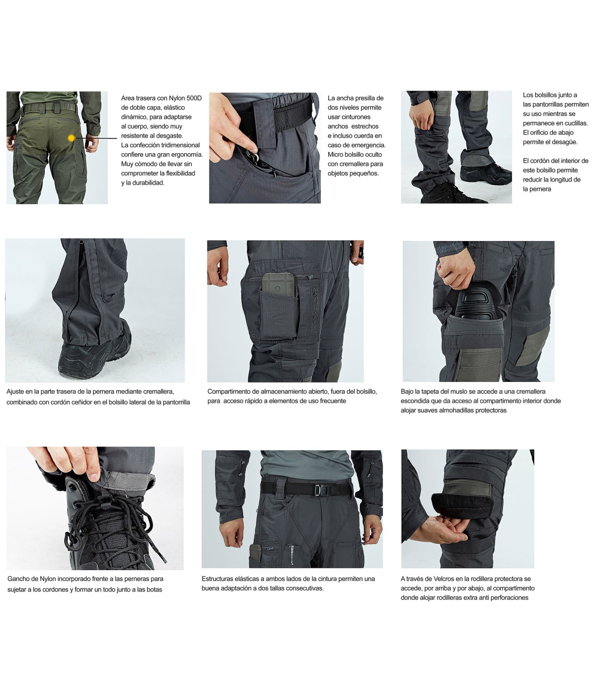 - AJUSTEMENT: taille élastique, crochet de sécurité, passants doubles et système de réglage des jambes avec zip et crochets