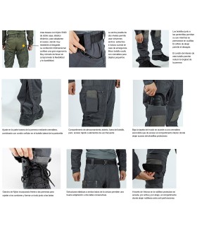 Durabilidad y resistencia: fabricados en Ripstop 65% poliéster/35% algodón, resistentes al desgarro y con refuerzos en rodillas y bolsillos críticos, además de tratamiento hidrófugo Teflón.Diseño ergonómico: corte...